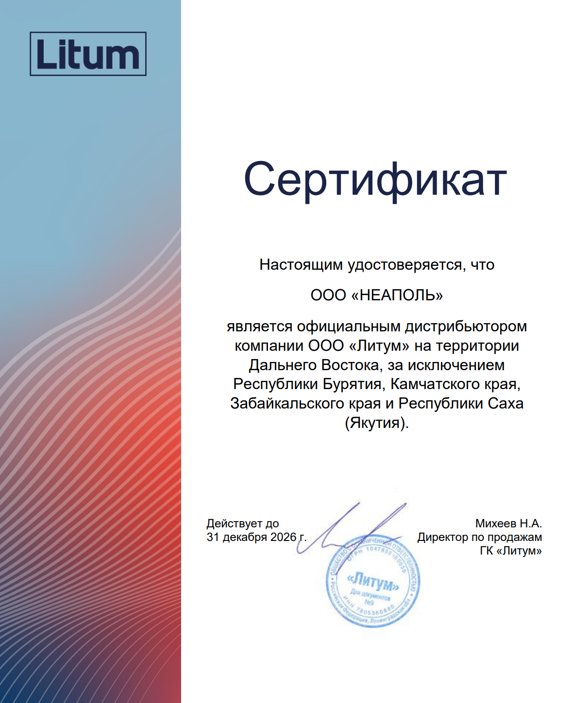 Сертификат официального дистрибьютора Litum